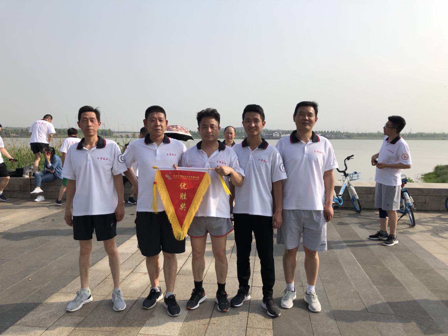 为庆祝5.1国际劳动节,增进销售团队的友谊,提升全体销售人员不畏艰难、敢于奋斗的精神,5月1日,利用节假日时间,由副总经理吴凤宾带队,组织销售部全体人员开展环绕宛陵湖跑步比赛活动。在活动中,分为4个小组,每个小组由5人组成。大家齐心协力、奋力拼搏,经过二个小时的比赛活动,决出第一名即优胜奖。