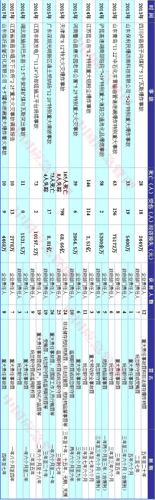 (注:获刑人数来自媒体报道,并非全部。有些事故并非一次审判,有些审判结果没有被报道,有些由事故引出的其他行贿、渎职案件另案处理,牵连人数也不包括在内。)