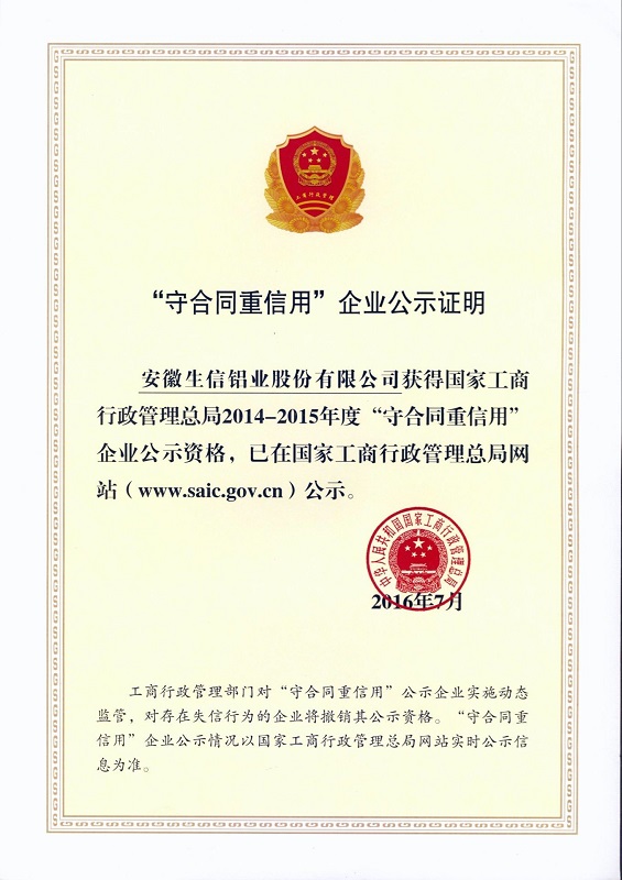 在调研结束后,刘富贵一行对生信铝业获得国家“2014-2015守合同重信用”单位荣誉进行了授牌。